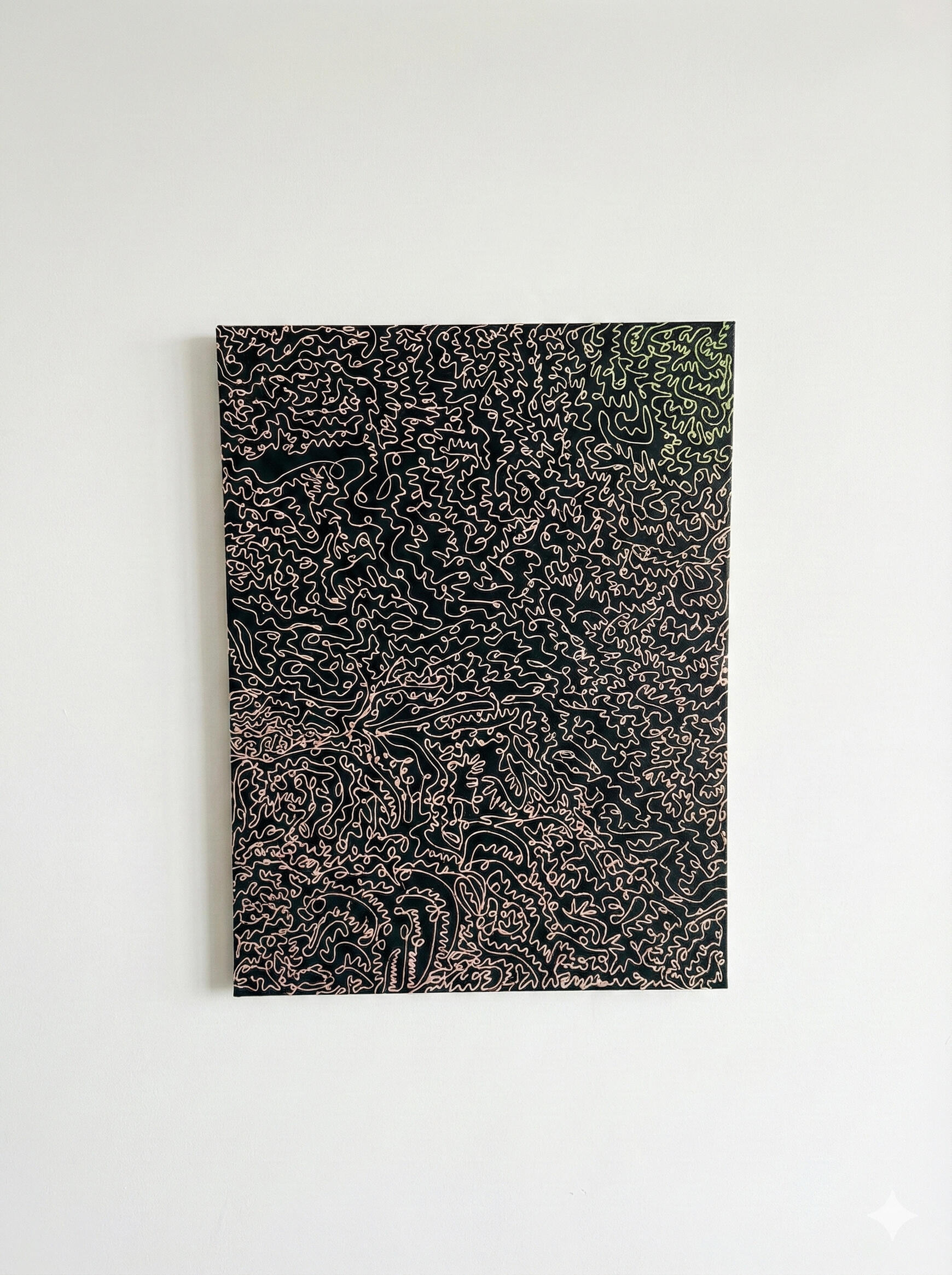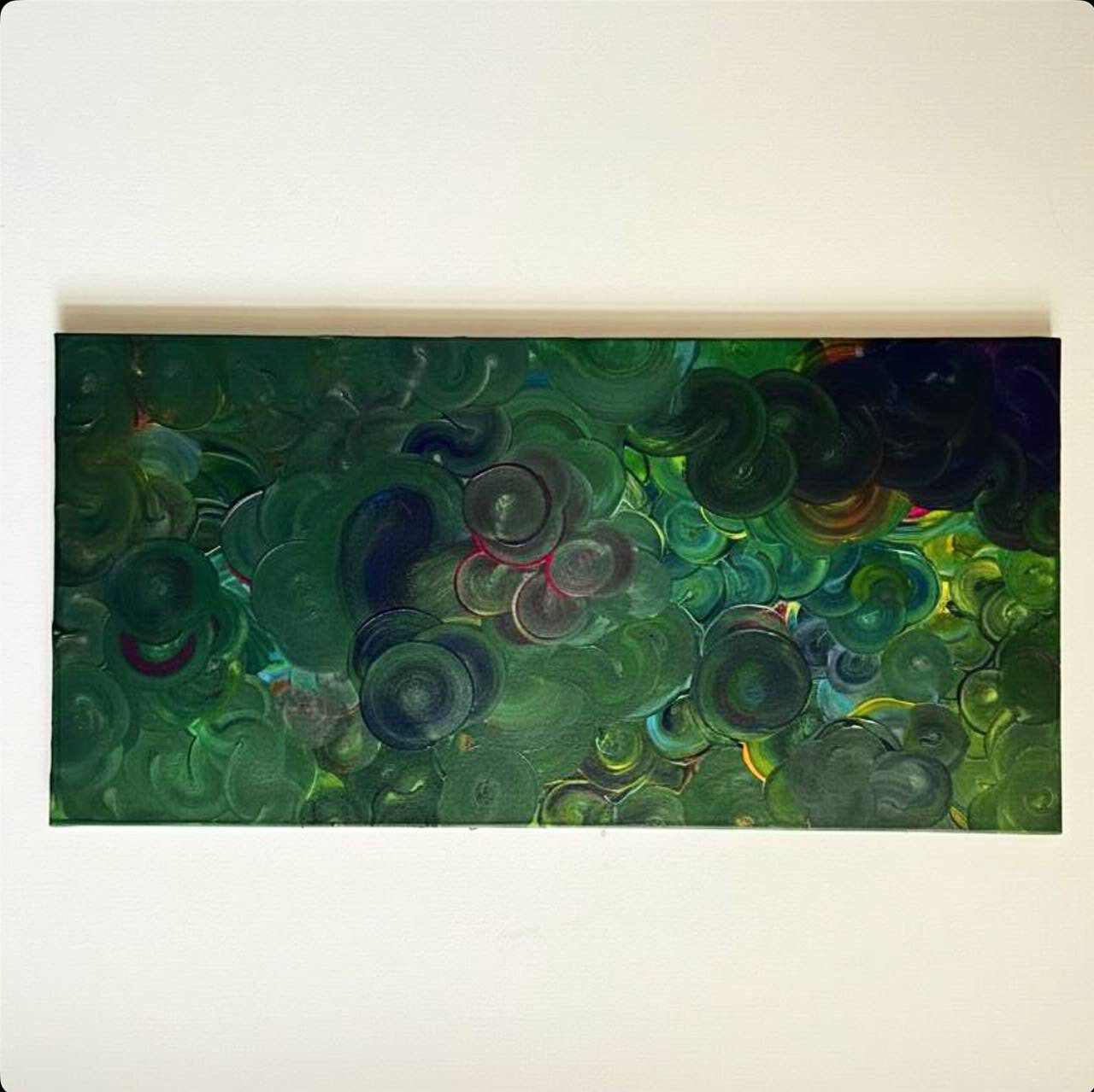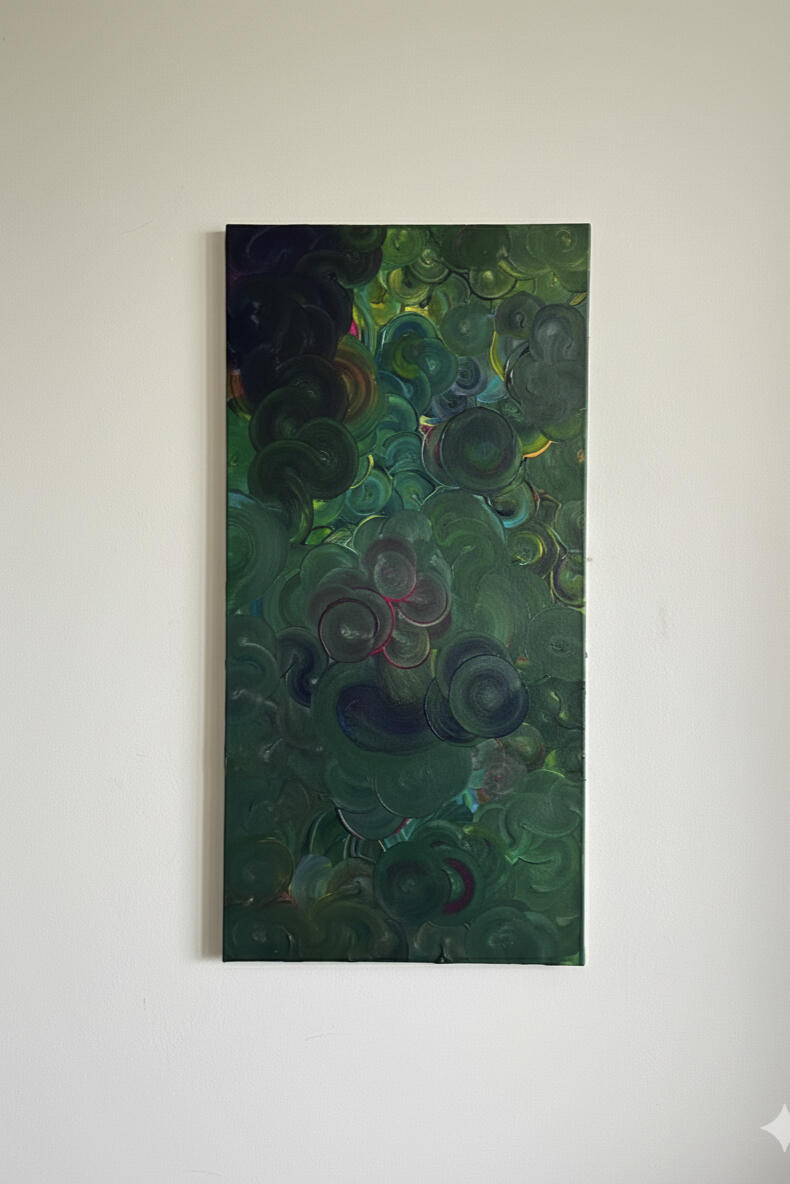 Stepping into the heart of a forest. Swirls of emerald and blue fold into one another, where light is scarce but alive. A quiet world, growing, patient and unbothered.